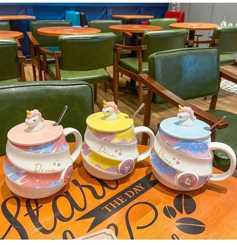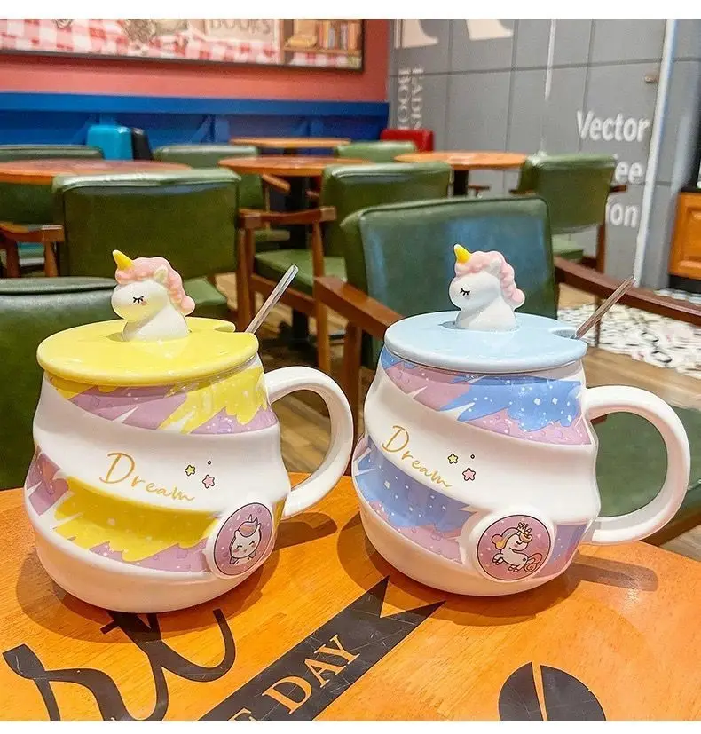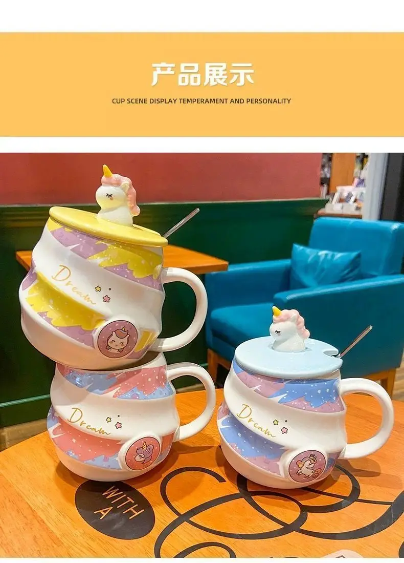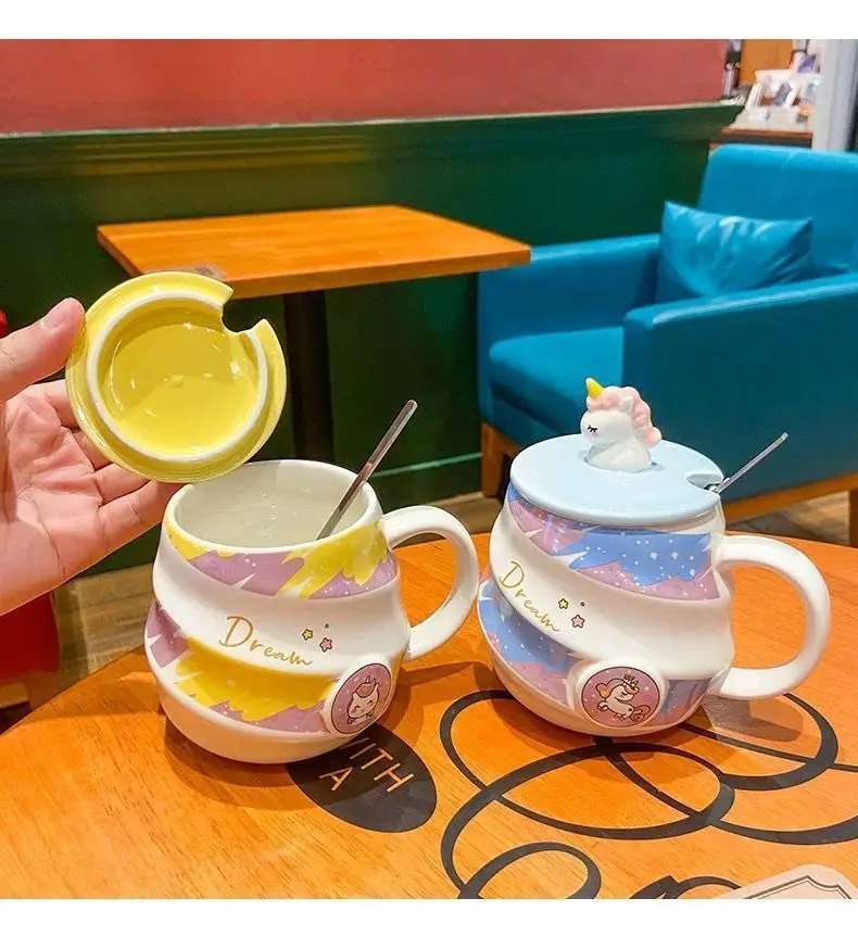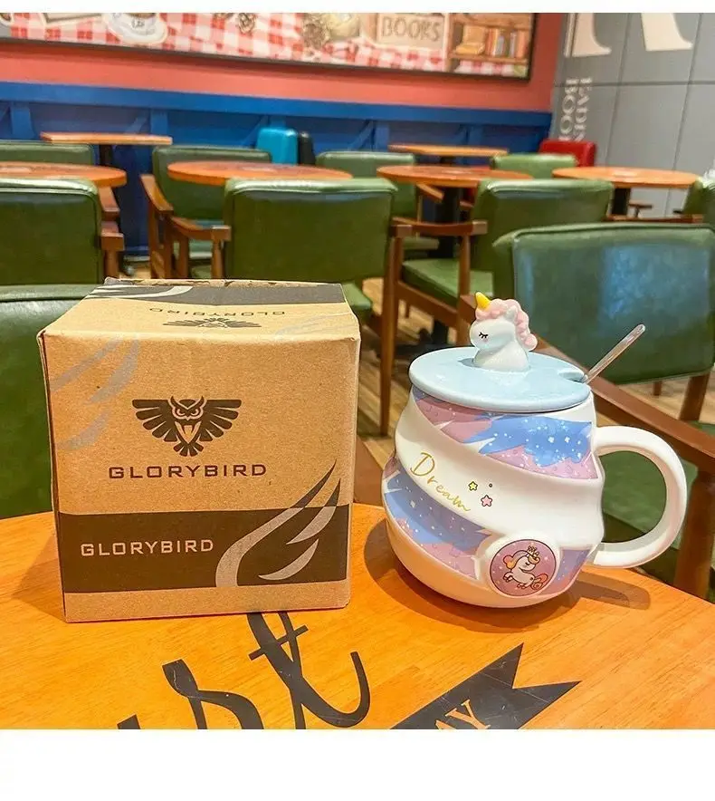 400ml Cute Unicorn Ceramic Cup Ins High Beauty Coffee Mug with Spoon Straw Box Dust Plug Small Summer Couple Water Cups Gift