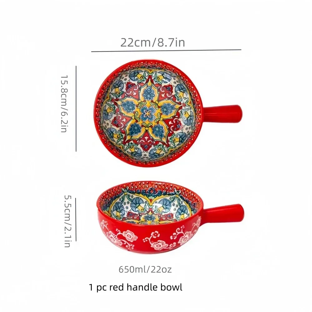 Bohemian Ceramic Hand-Painted Embossed Patterned Salad Bowl with Handle Kitchen Bakeware Microwave & Oven Safe 1 pc