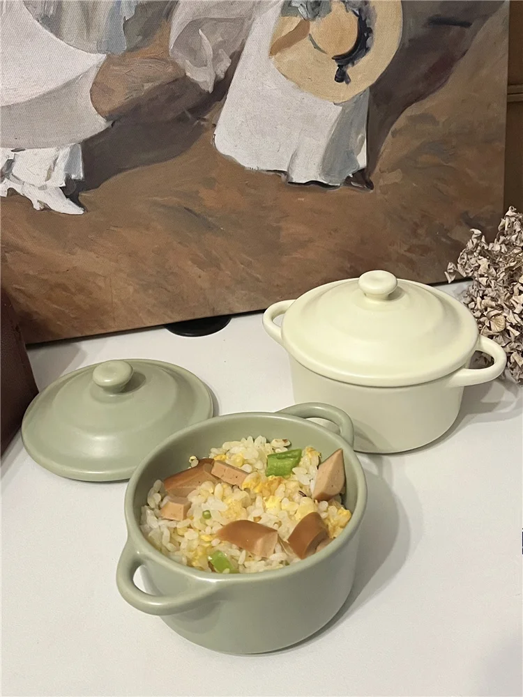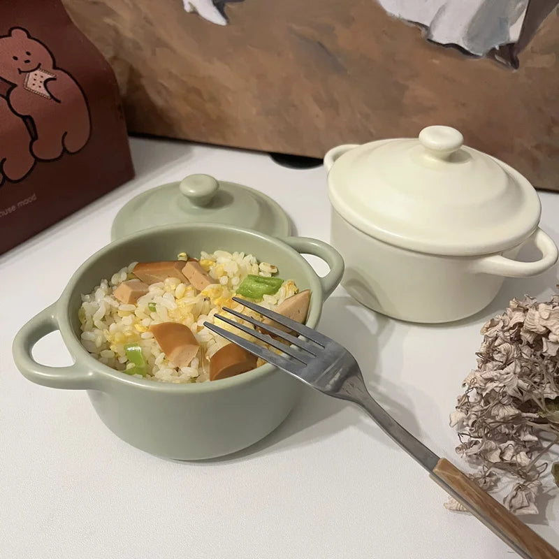 This is a versatile 220ml ceramic small bowl, designed for microwave, air fryer, and oven use, featuring a chic covered double ear design.