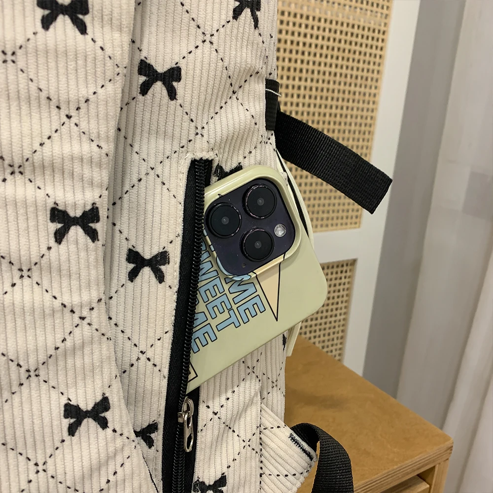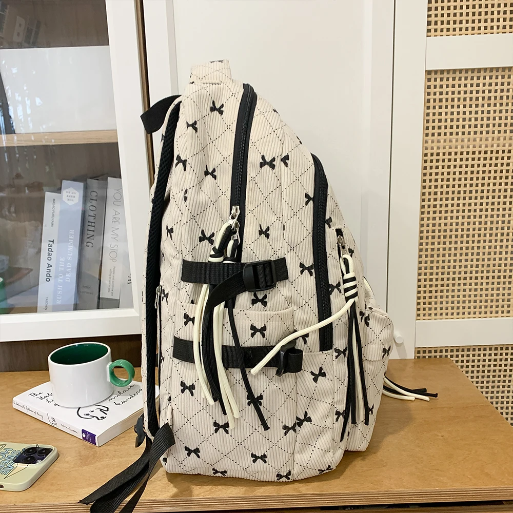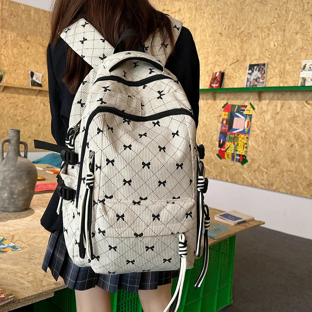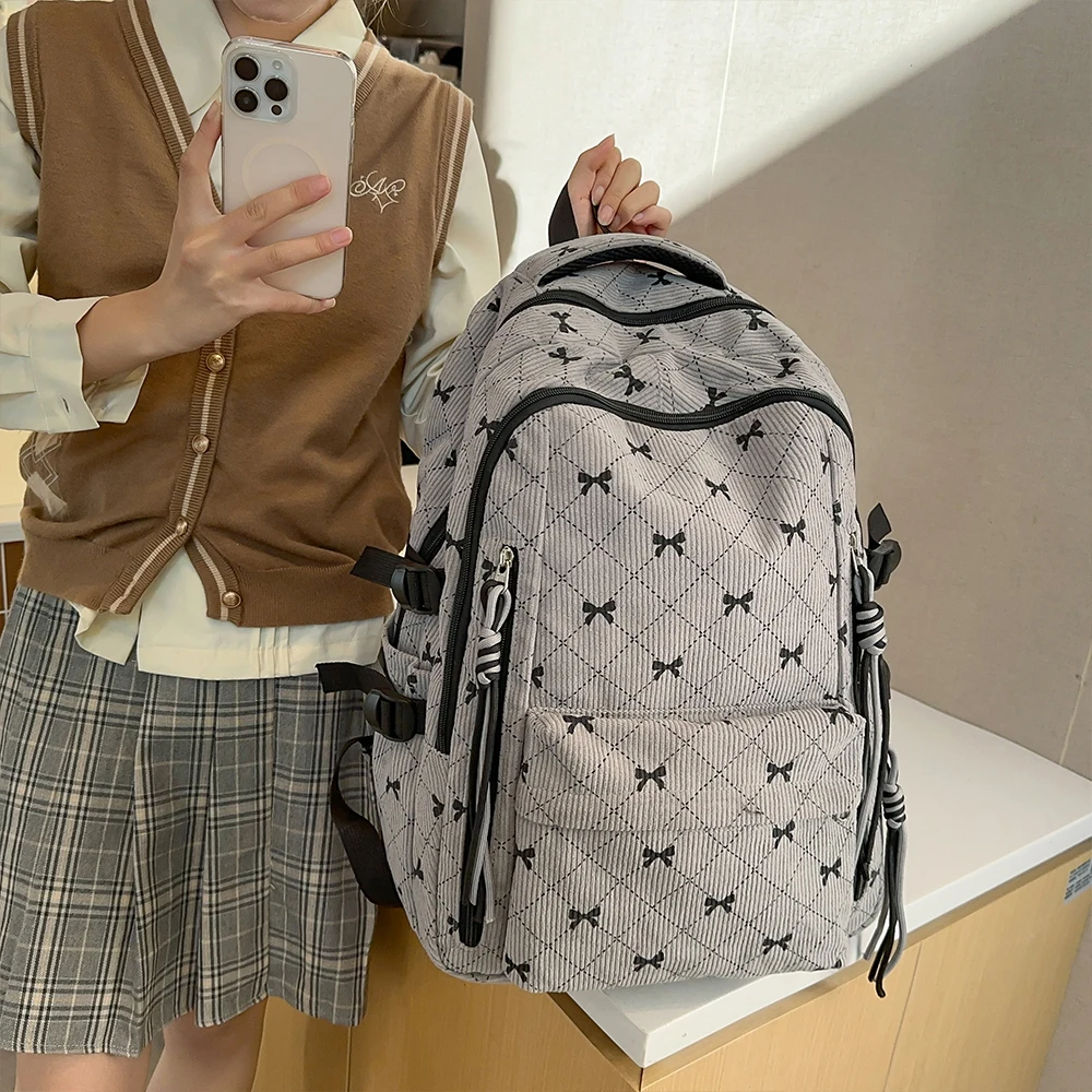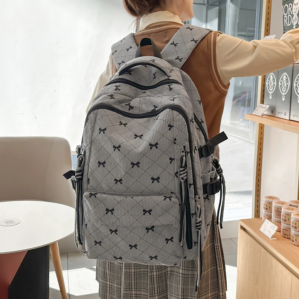 This is a stylish corduroy backpack featuring a playful bow design, perfect for everyday use in autumn and winter.