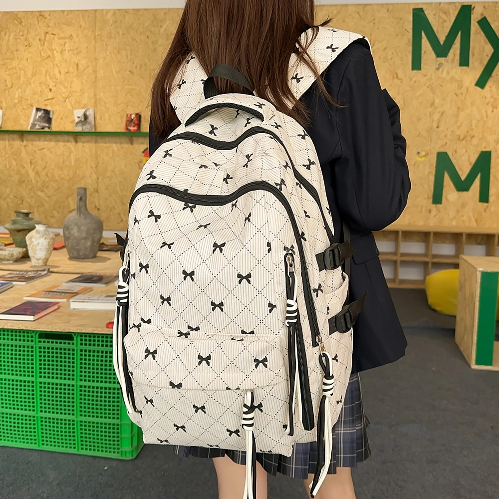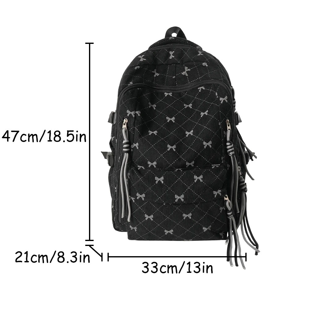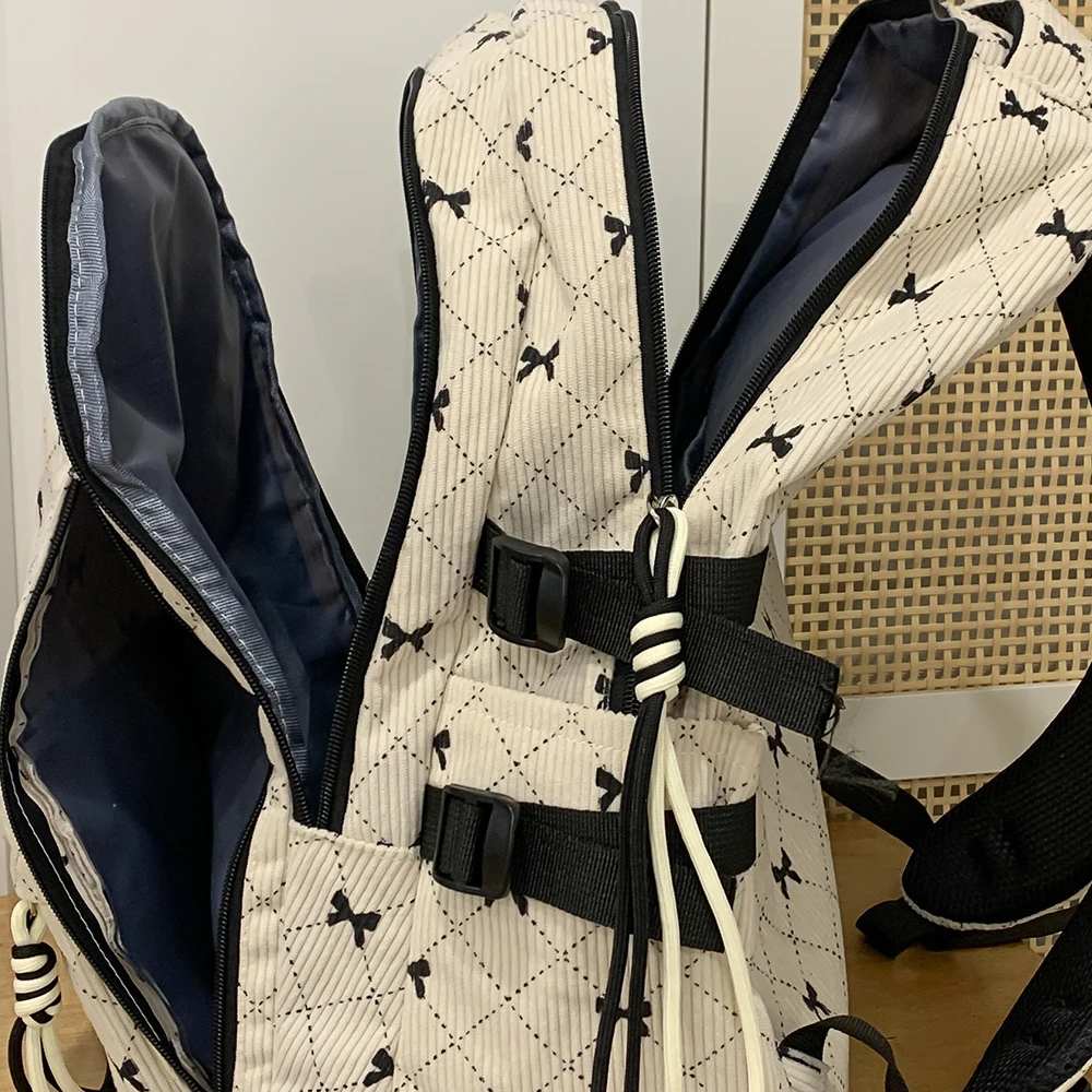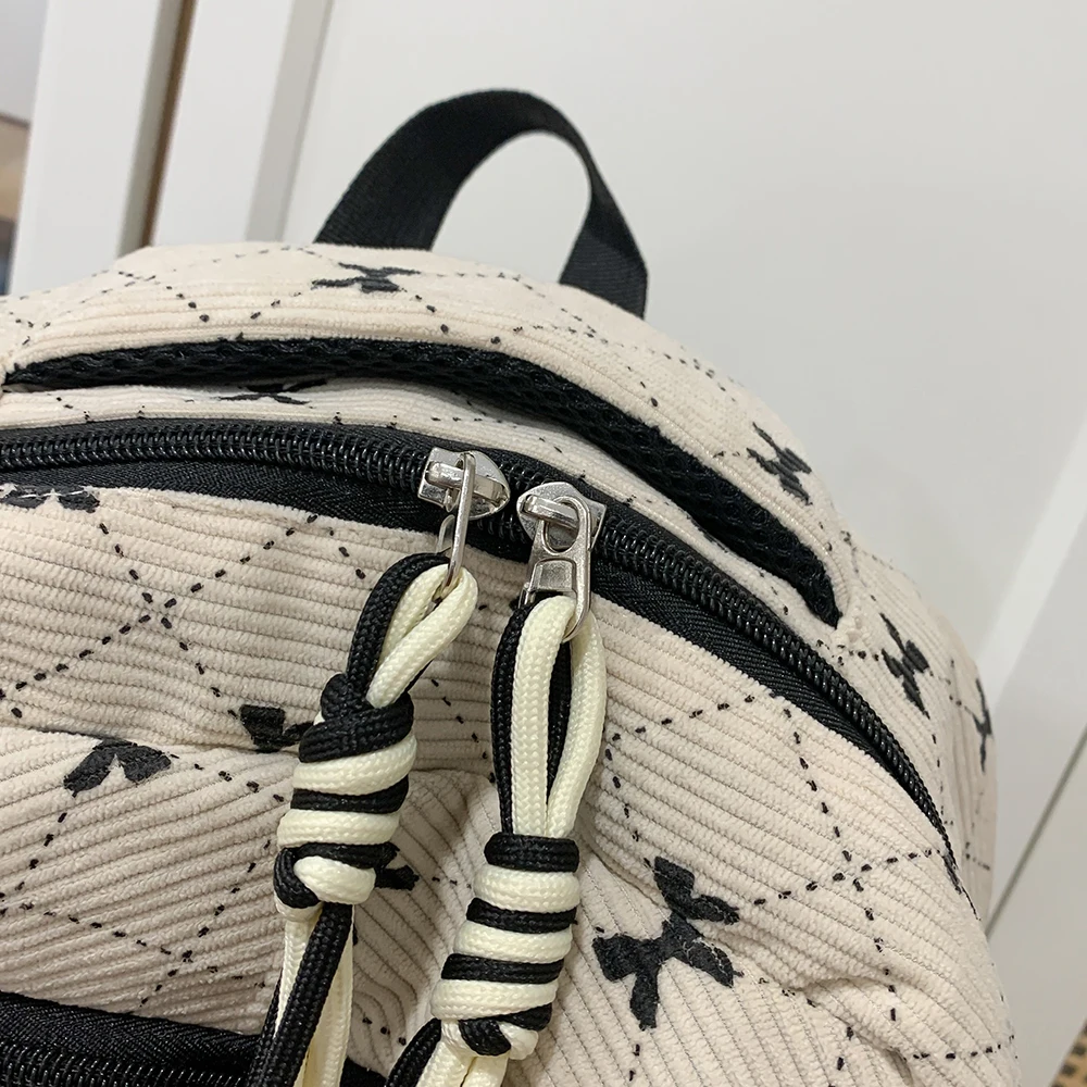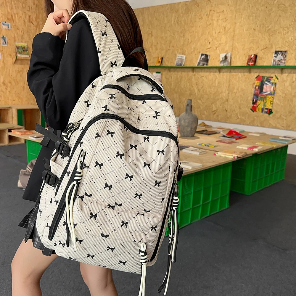 This is a stylish corduroy backpack featuring a playful bow design, perfect for everyday use in autumn and winter.