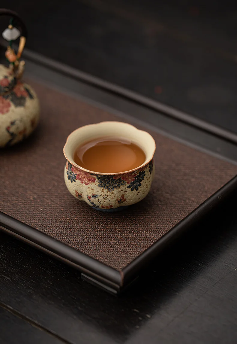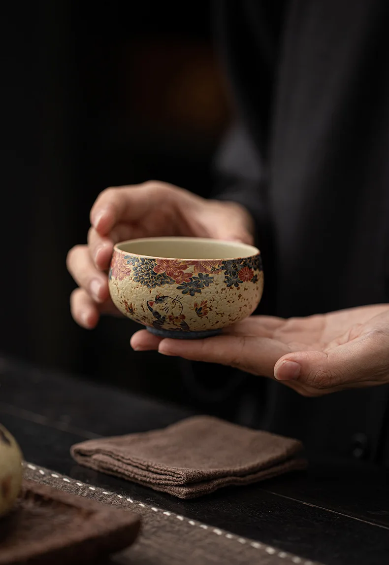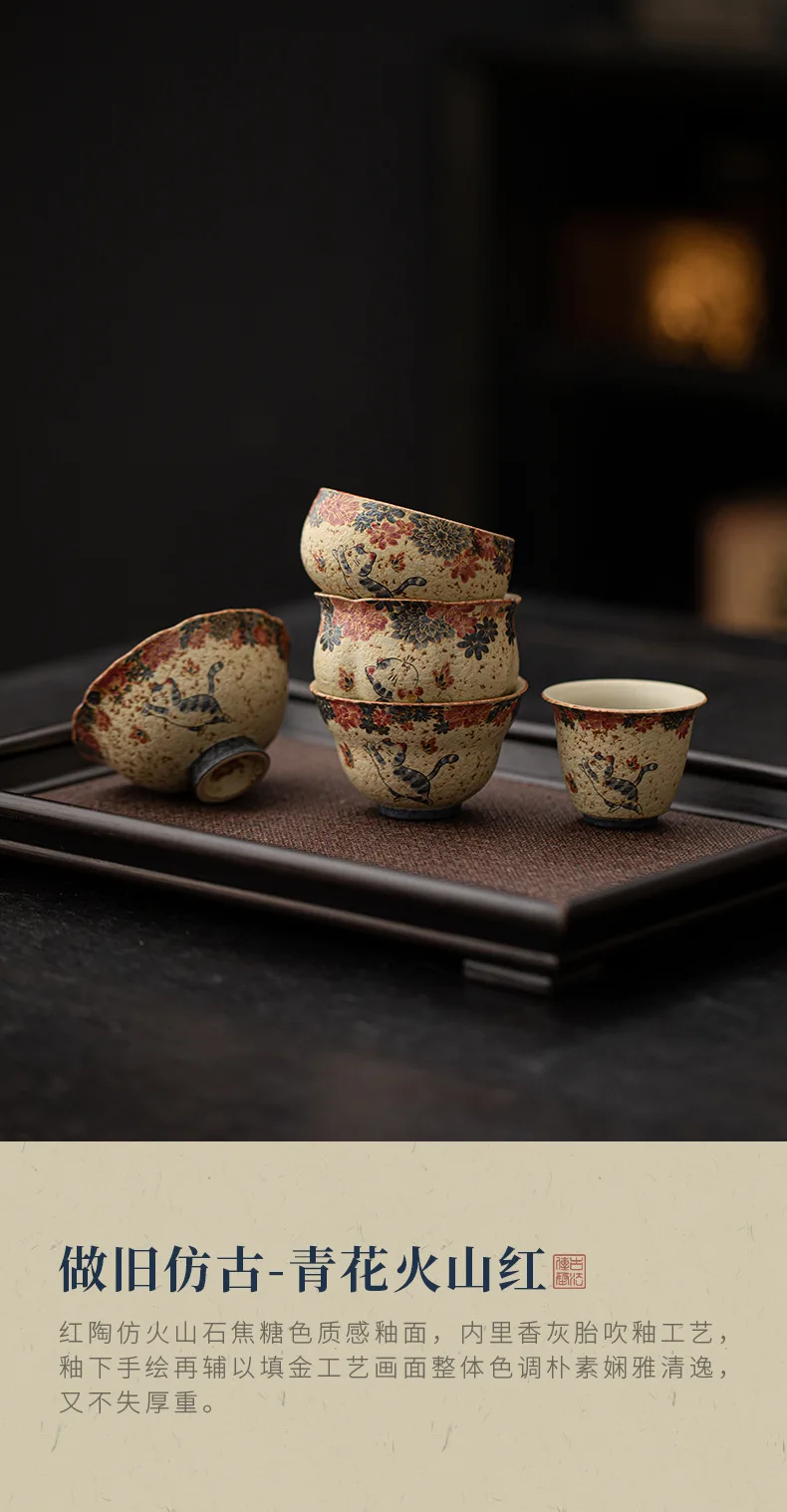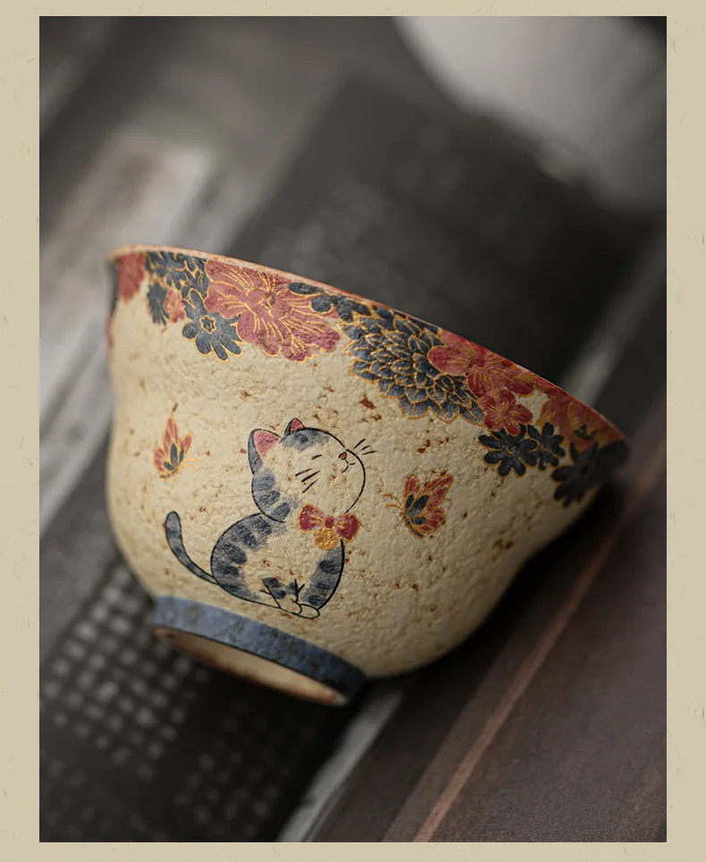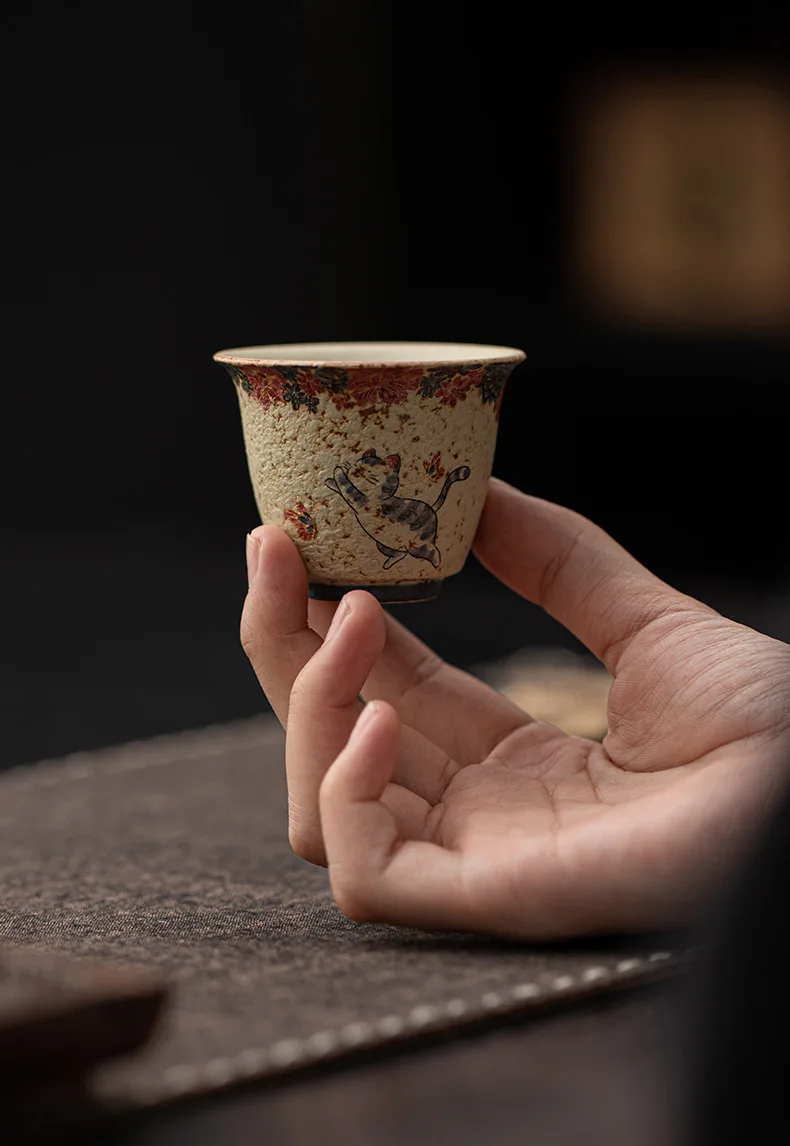 Cute Cat Vintage Teacup Chinese Coarse Pottery Ceramic Opening Cup Pottery Beautiful Tea Cups Set Teaware for Kung Fu Tea
