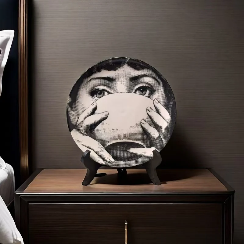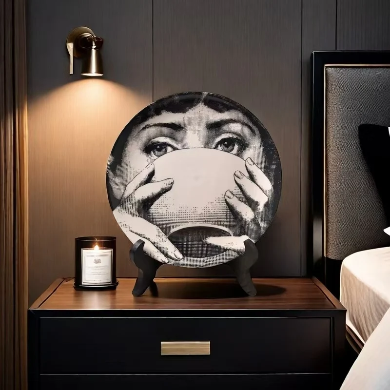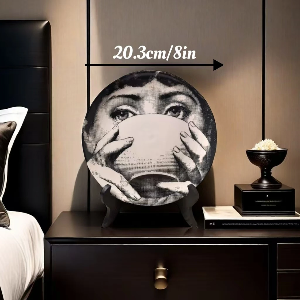 This is an 8-inch retro ceramic decorative plate featuring a modern woman design, suitable for various decor settings and safe for microwave use.