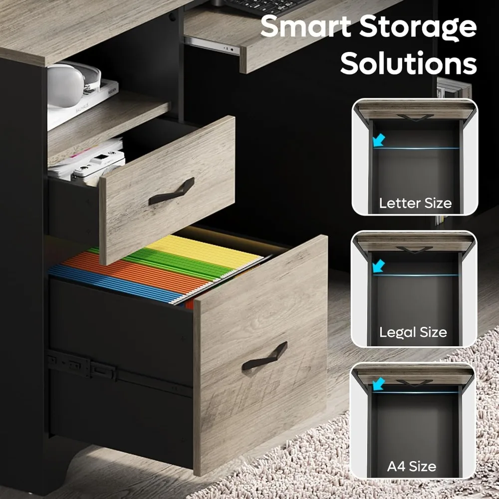 - Versatile Storage: The desk includes 2 open storage compartments, a storage drawer, and a file drawer that accommodates letter/A4/legal-size files, enabling efficient organization.
