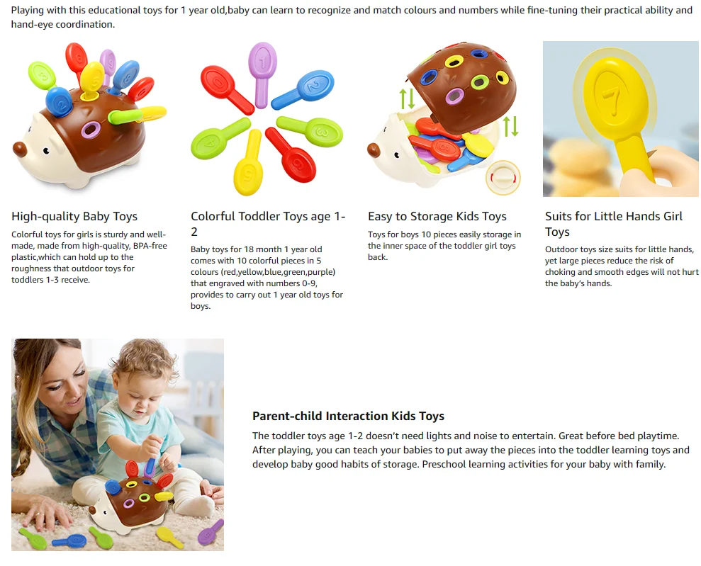 This fine motor learning toddler toys for 1 year old is a creative sorting toys offering educational development for toddlers,which offers a simple yet timeless design,girls toys is great for developing fine motor skills and kid's creativity. And kids toys train their minds to explore and grow at their own pace.