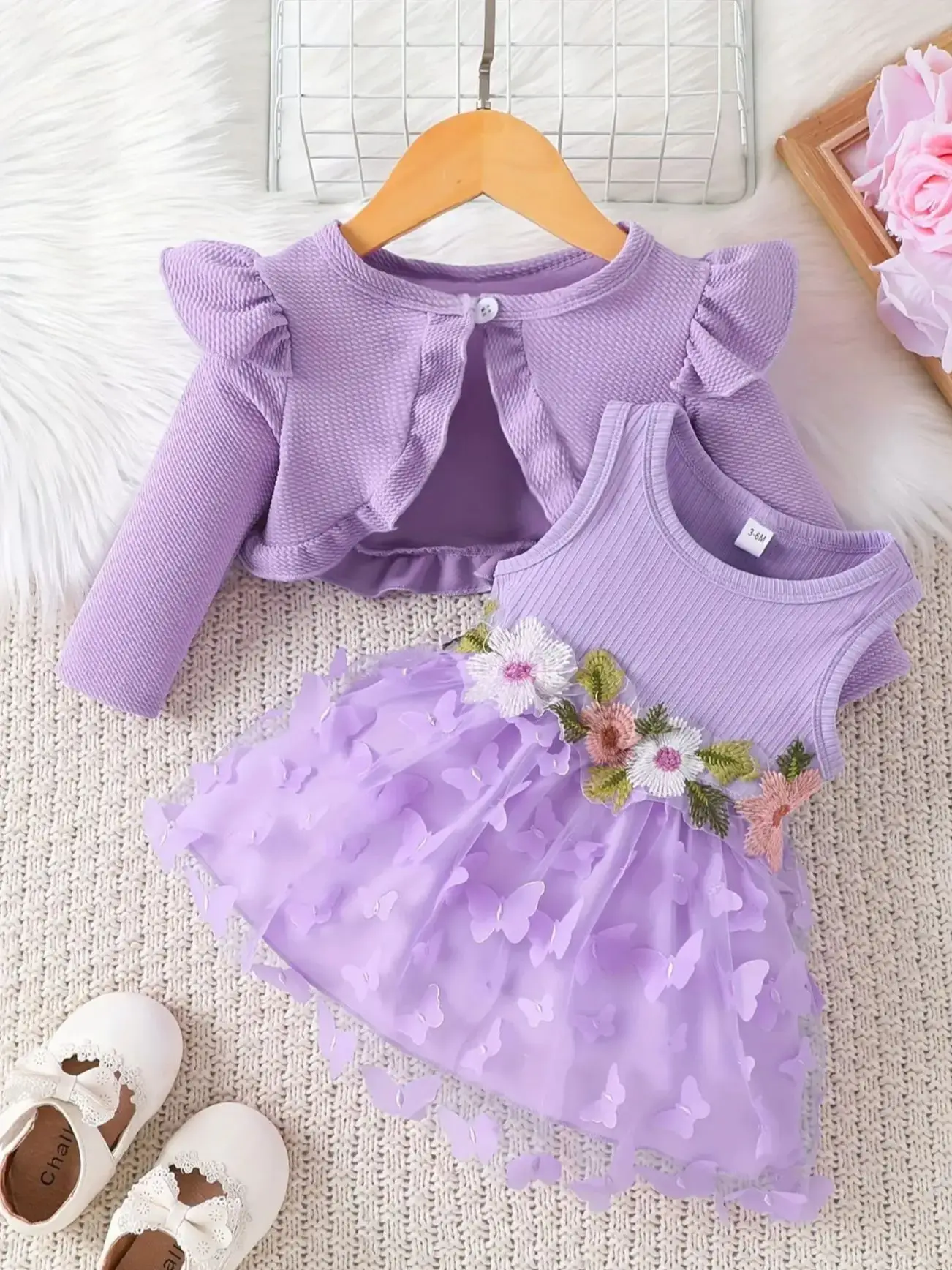 Infant Toddler Girls' Purple Outfit: 3D Butterfly Tulle Dress + Ruffled Knit Cardigan Two-Piece Set