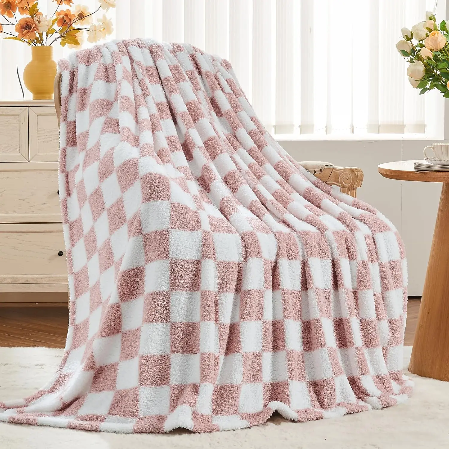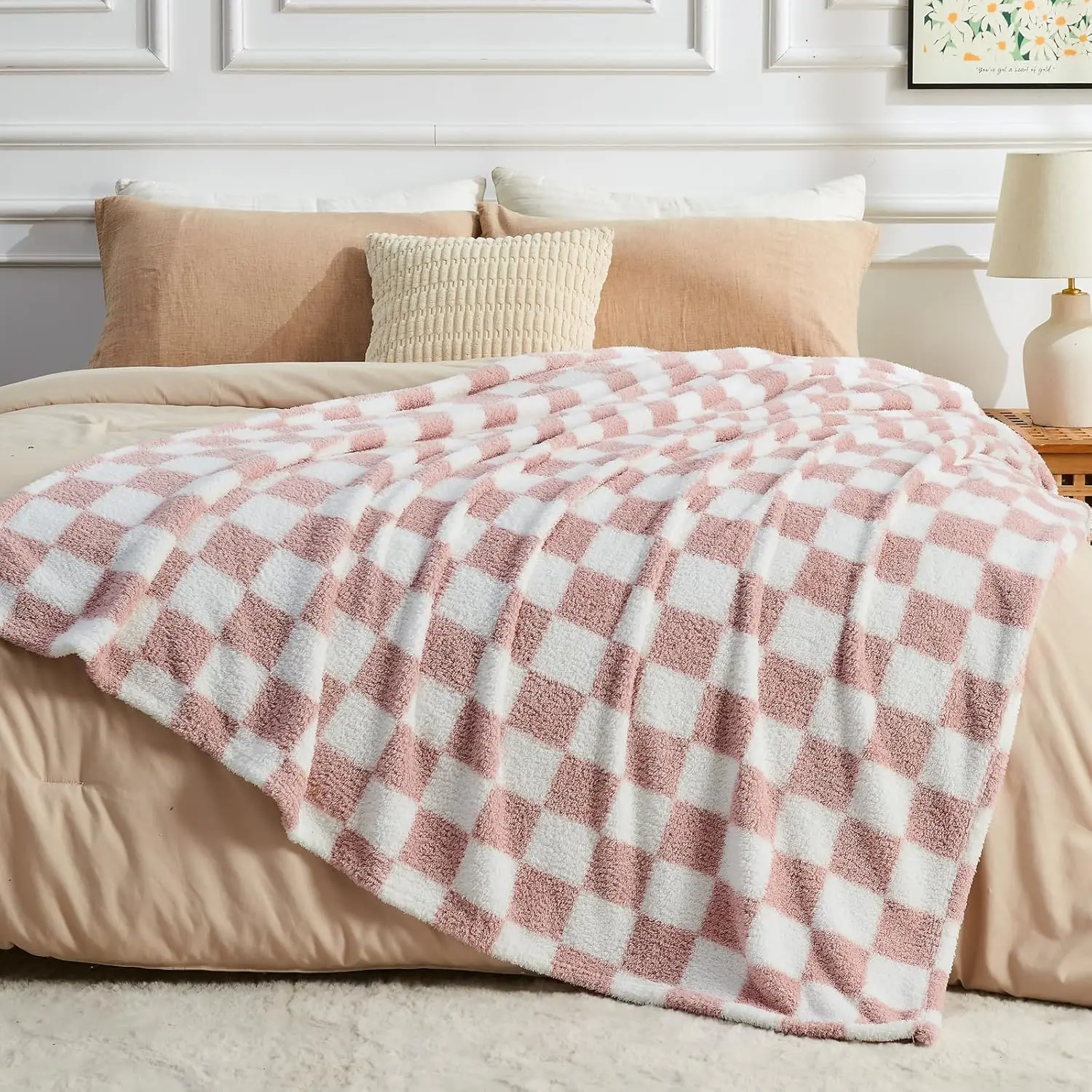 Knitted Pink & White Checkered Throw Blanket — Super Soft Fuzzy Lightweight Microfiber Plush Blanket for Couch, Bed, or Sofa 50"x60"