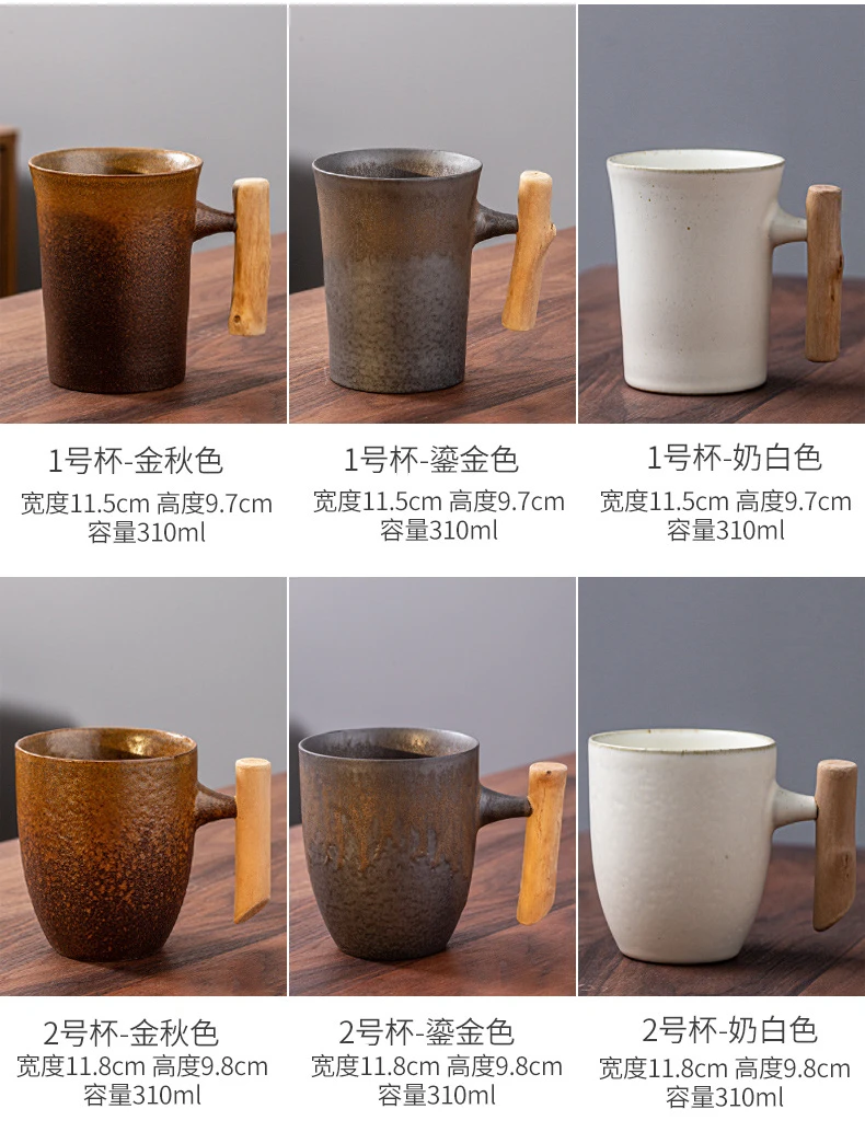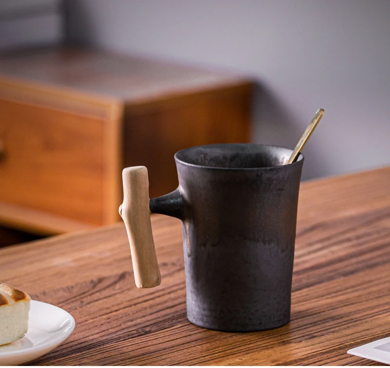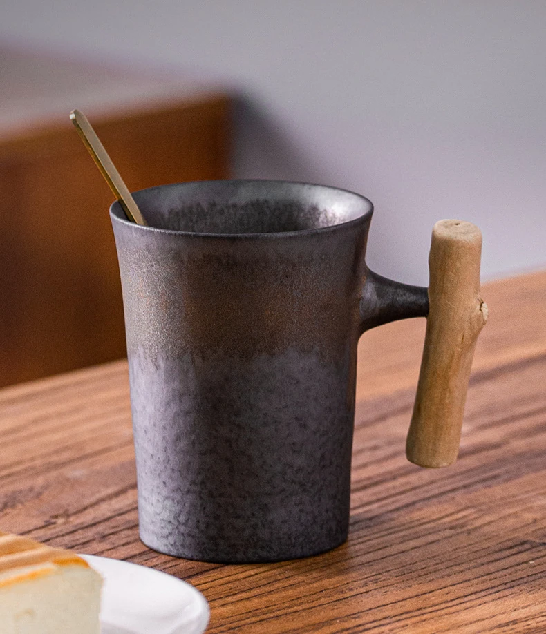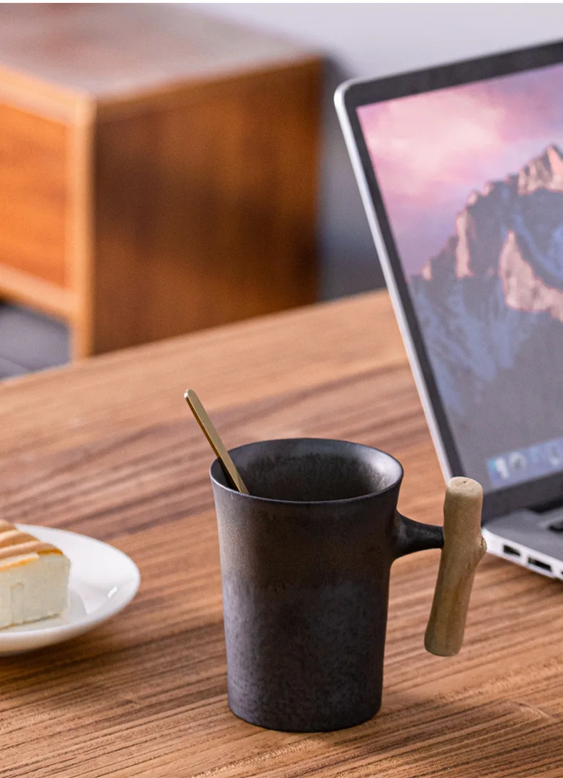 This is a stylish ceramic coffee cup featuring a wooden handle, designed for a variety of beverages including coffee, tea, and milk.