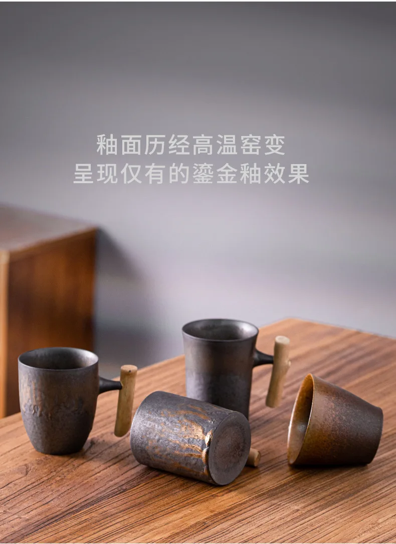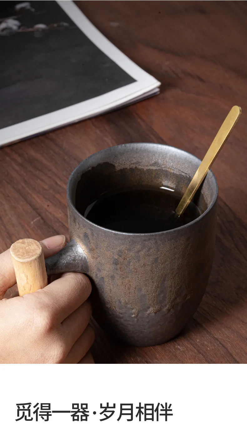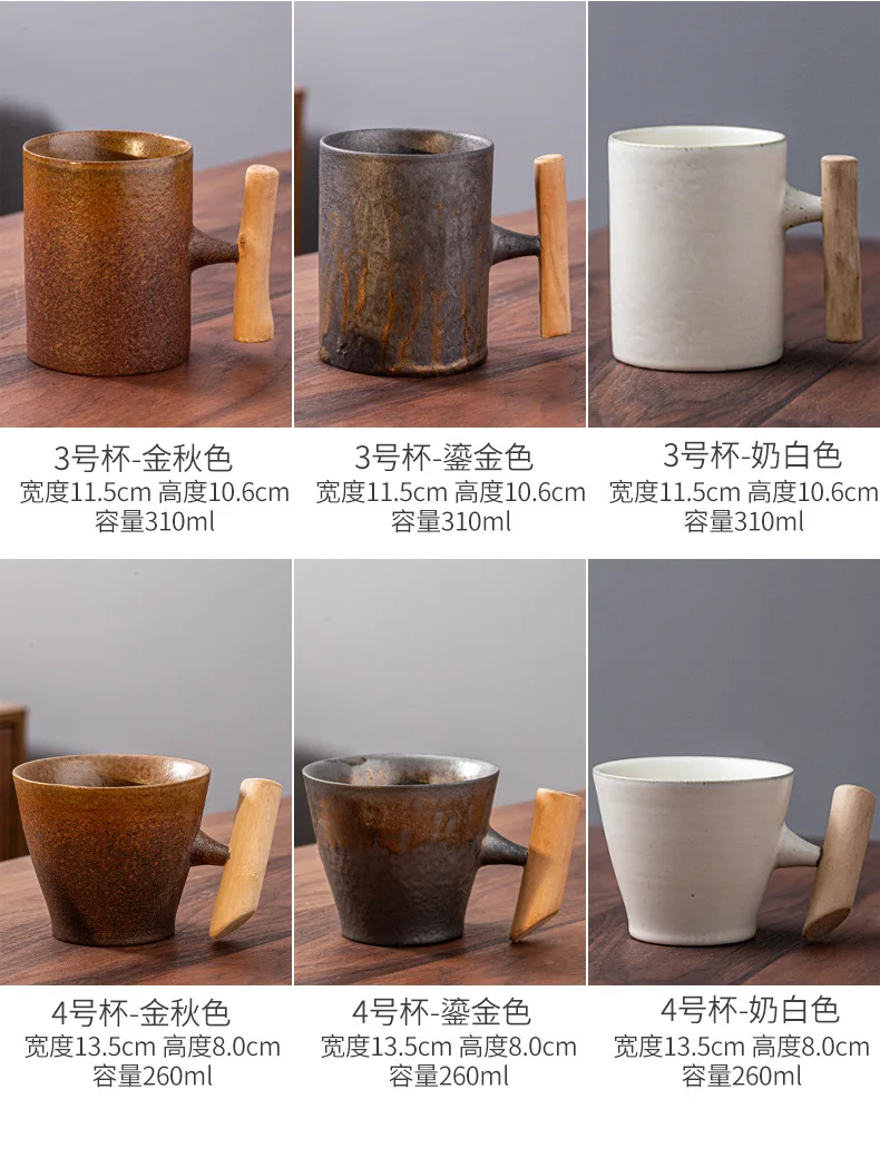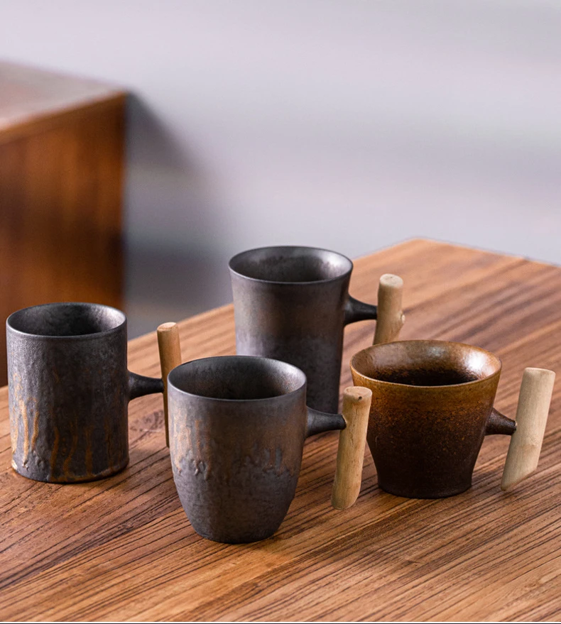 This is a stylish ceramic coffee cup featuring a wooden handle, designed for a variety of beverages including coffee, tea, and milk.