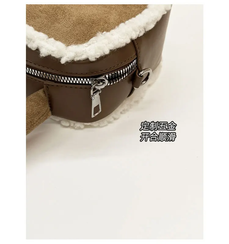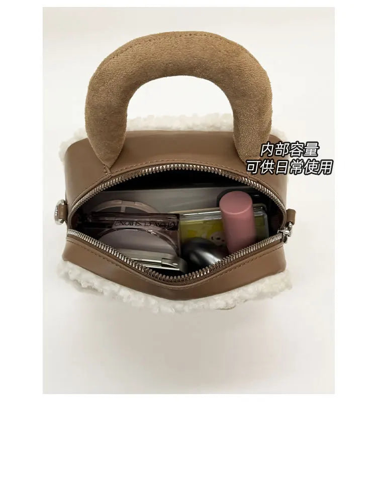 The bag is crafted from soft polyester and lamb fleece, offering a cozy feel.