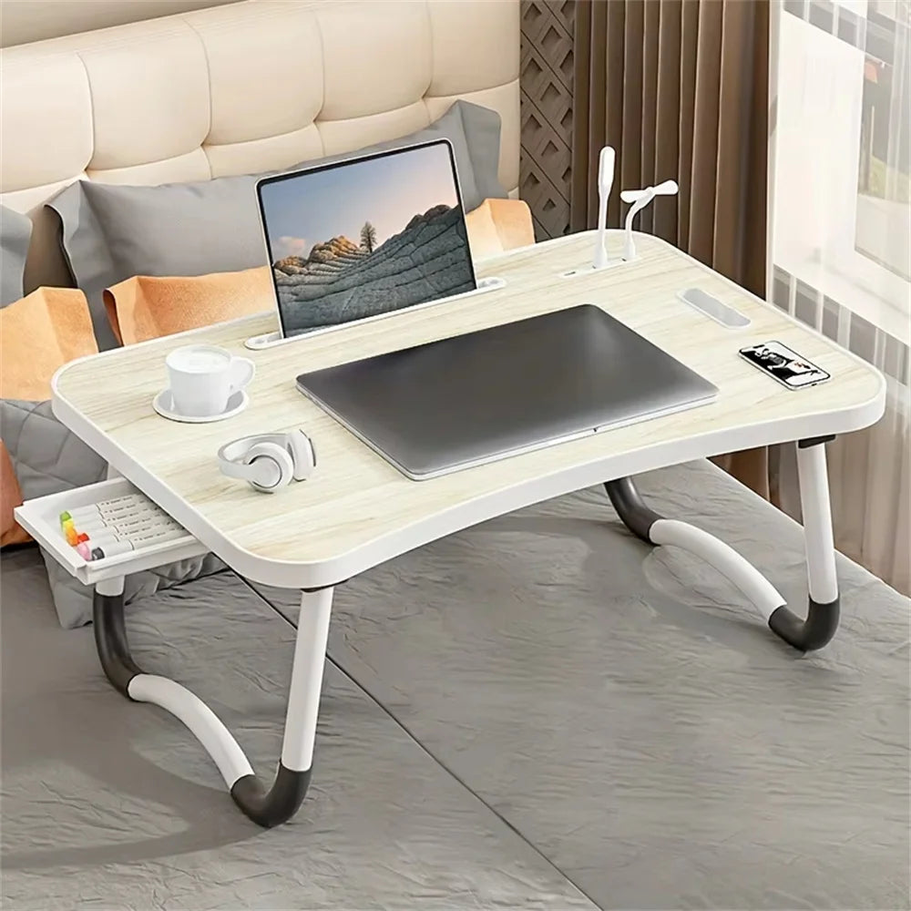 This is a portable, foldable laptop table designed for comfortable working from your bed or couch, featuring USB ports, a storage drawer, and a cup holder.