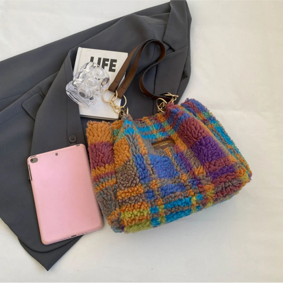 Red Plaid Lambswool Shoulder Bag | Large Capacity Tote for Women
