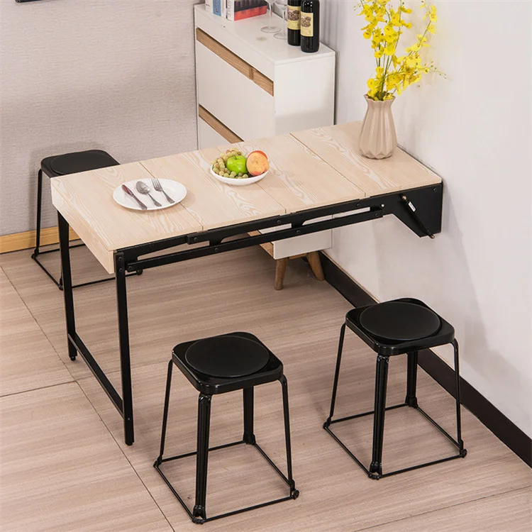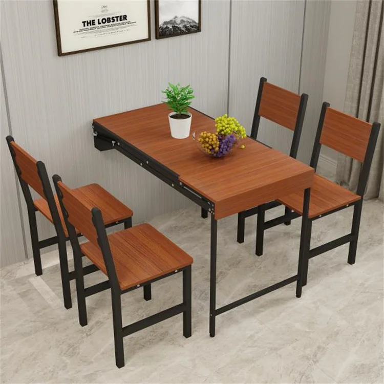 This is a multifunctional wall-mounted folding dining table that comfortably seats four people while saving valuable floor space.
