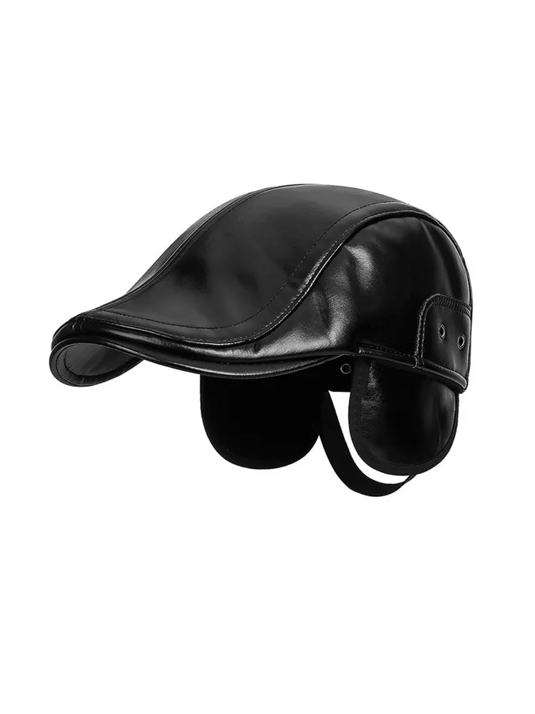 Warm men's fleece lined PU leather duckbill cap with ear flaps for winter 2026. Windproof faux leather, adjustable fit & cold-proof design. Perfect outdoor shopping casual winter protection!