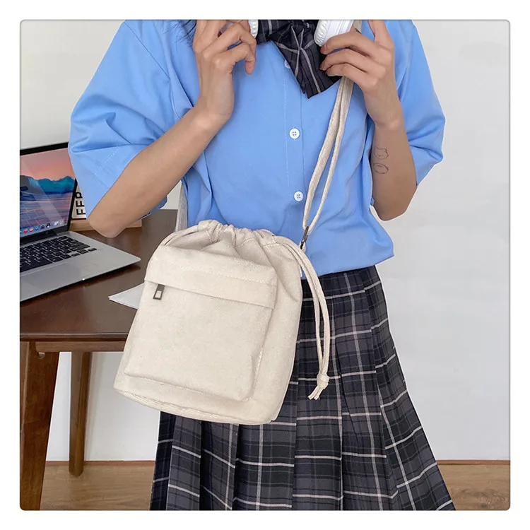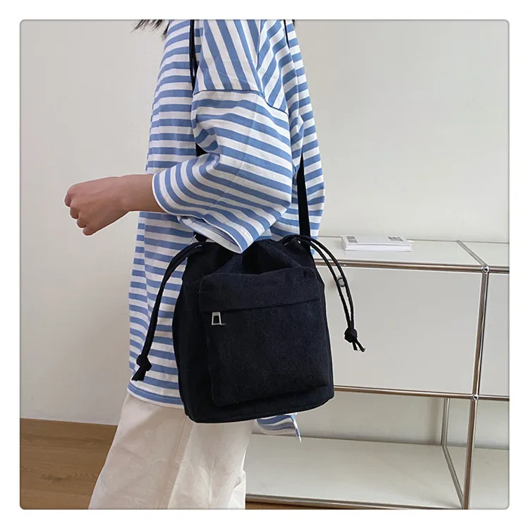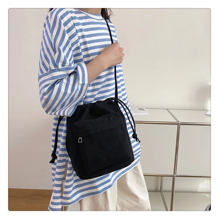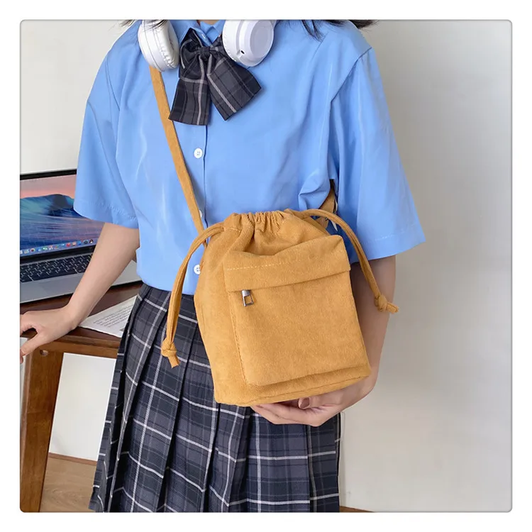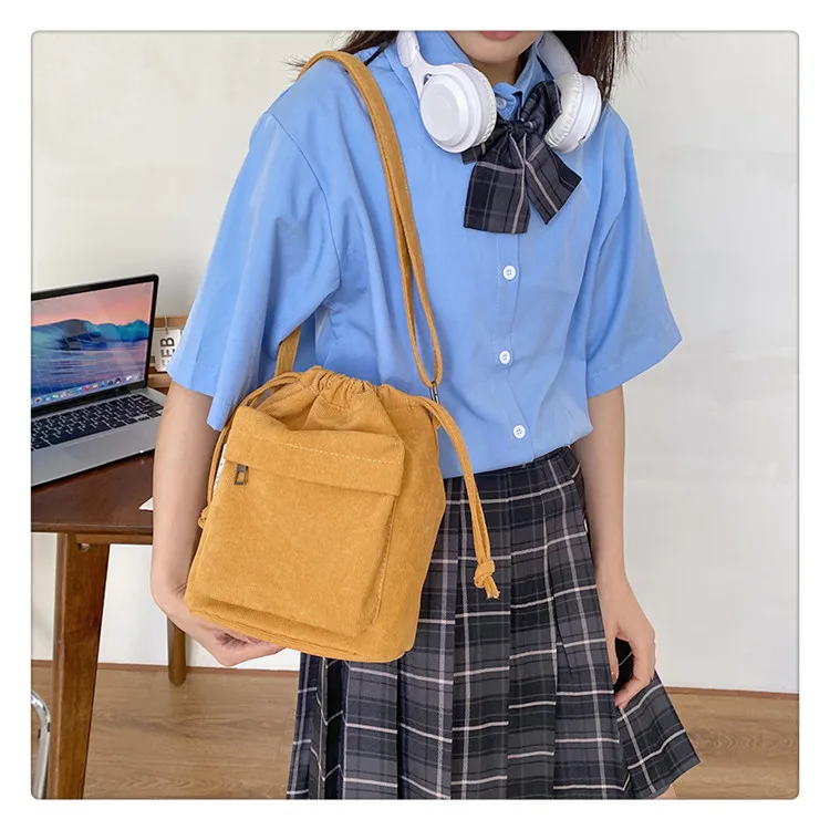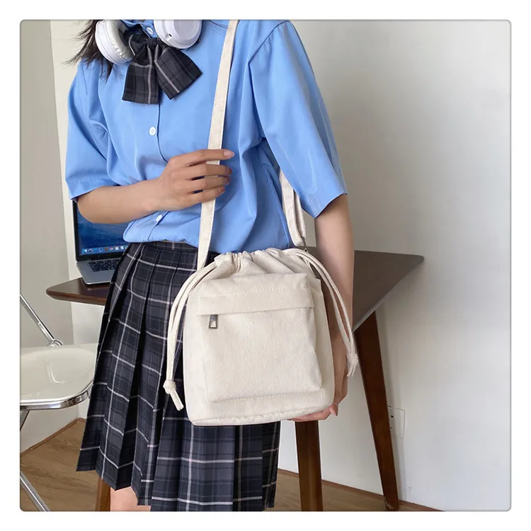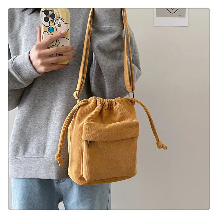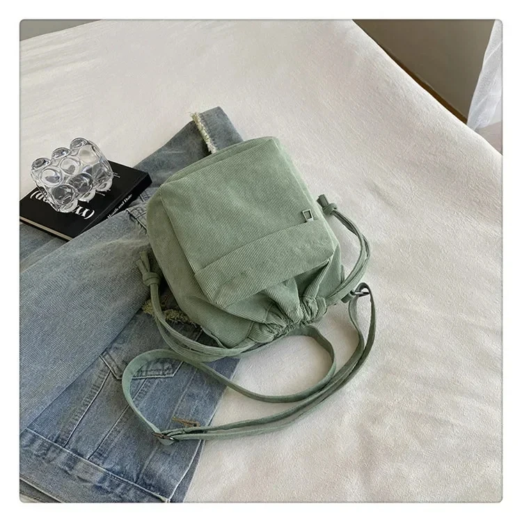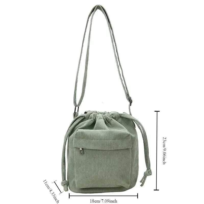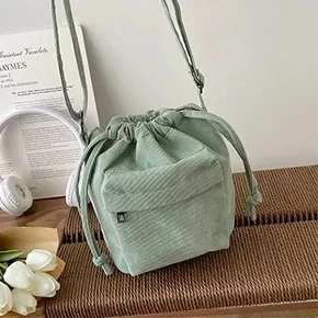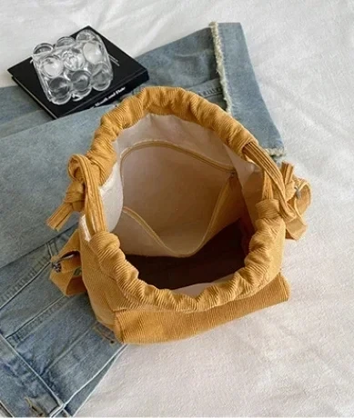 The bag is crafted from durable corduroy, providing a soft and appealing look.